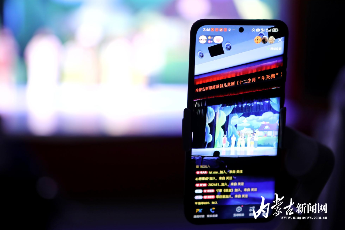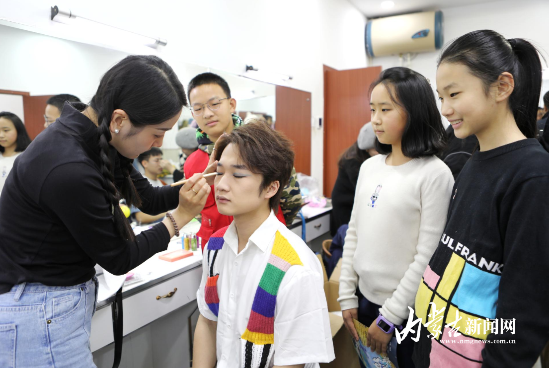 “我想體驗(yàn)馬的道具”“我想試試兔子的道具”……當(dāng)日,在《十二生肖“斗天狗”》正式演出前,小記者們來到呼和浩特民族劇場后臺(tái),看了演員化妝和換裝過程,部分小記者還試戴演出道具。工作人員又帶領(lǐng)大家走上舞臺(tái),參觀舞美布景和道具的工作區(qū)域,以及座位布局、燈光系統(tǒng)等設(shè)施,了解幕后工作人員是如何精心打造每一個(gè)場景的。